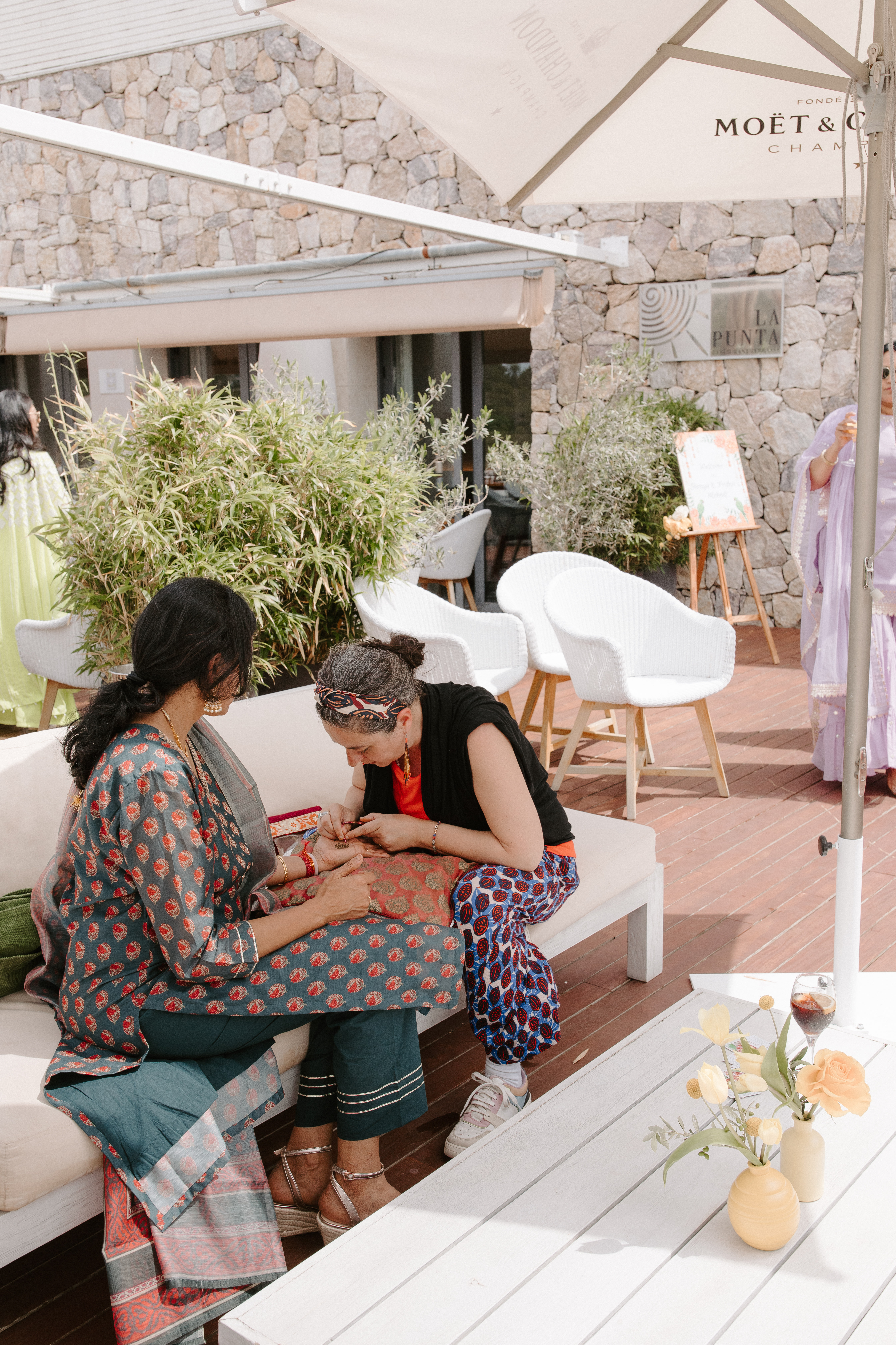 In Sitges, a coastal town in Spain‘s Andalusian region, we once attended a beautiful mehendi function. A mehendi event is a pre-wedding celebration where family and friends gather to decorate the bride’s hands and feet with henna. Henna (or natural tattoos) is meant to bring color, good luck and happiness into the festivities and the union of the groom and the bride.